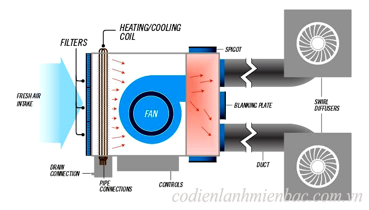 FCU là tên viết tắt của cụm từ Fan-Coil Unit. Nó là một thiết bị xử lý không khí, cơ bản như một AHU thu nhỏ. Cấu tạo gồm: Quạt (Fan), dàn ống trao đổi nhiệt (Coil). Trong một vài trường hợp thì thiết bị này còn có thêm bộ sấy điện (Heater) nhưng không phổ biến, nhất là tại Việt Nam ít lạnh sâu và dài ngày. Vì là một thiết bị được sử dụng để xử lý không khí theo vùng nhỏ, nên công suất rất khiêm tốn, chỉ khoảng từ 2kW-20kW.