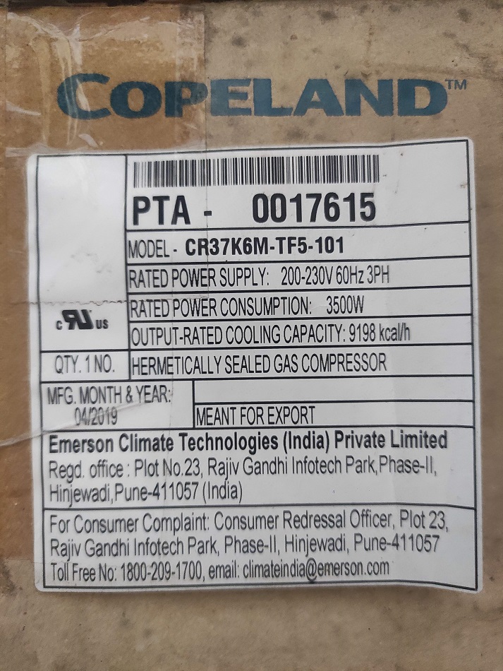 Máy nén CR37K6M-TF5-101 là một dạng máy nén cuộn của Copeland, sản xuất tại Ấn Độ.Thông số kỹ thuật: