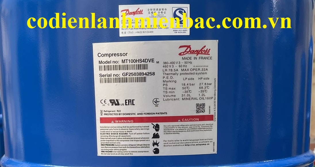 Máy nén MT100HS4DVE là một dạng máy khí piston của Danfoss, sản xuất tại Pháp.Thông số kỹ thuật: