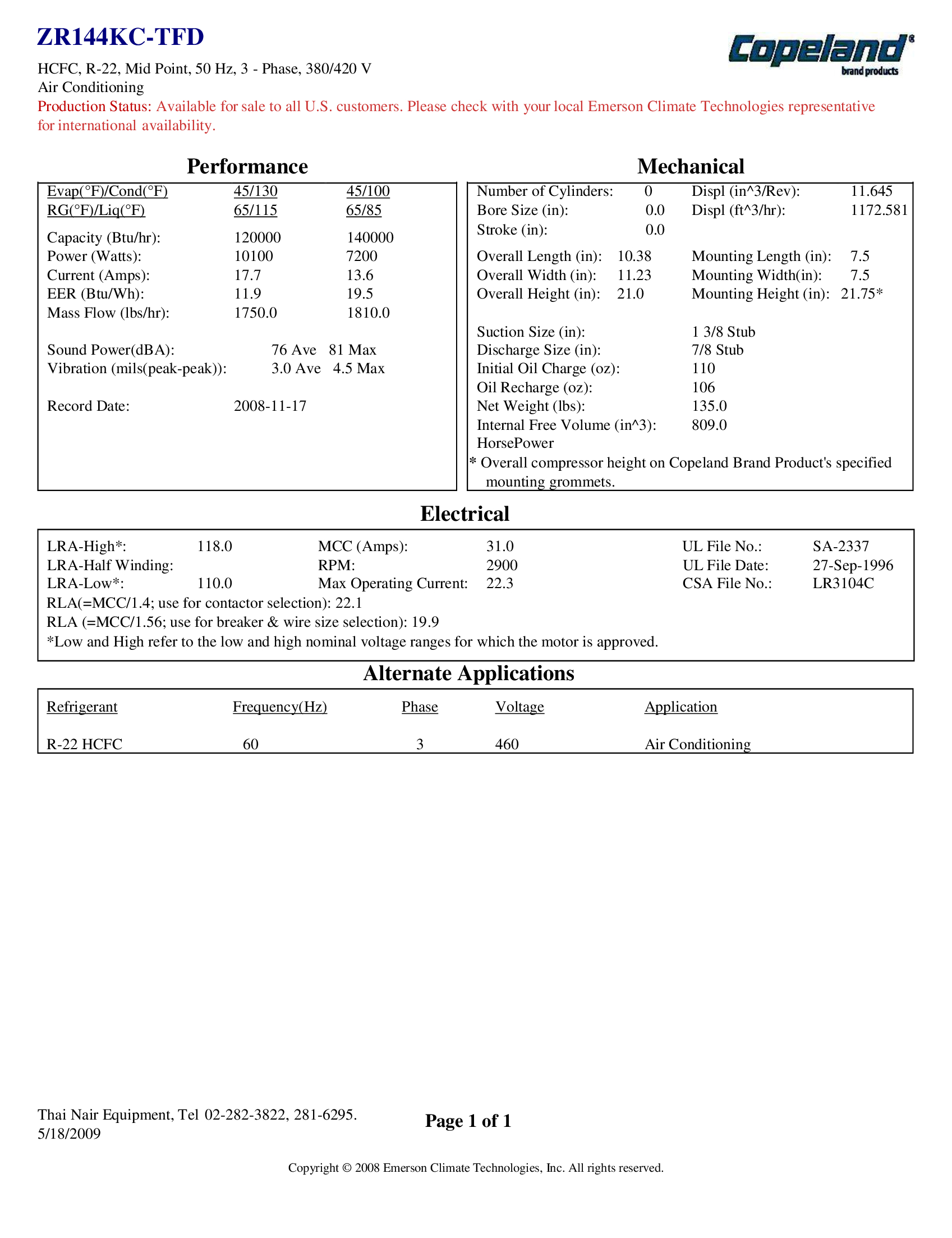 Máy nén ZR144 KC – TFD – 522 là một dạng máy nén xoắn ốc của Copeland, sản xuất tại Thái Lan.Thông số kỹ thuật: