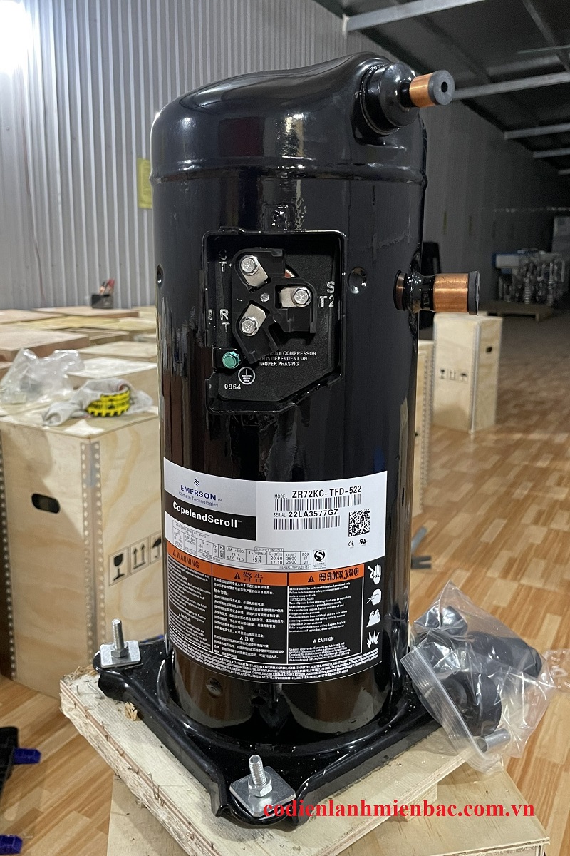Máy nén ZR72KCE-TFD-522 là một dạng máy nén xoắn ốc của Copeland, sản xuất tại Thái Lan.Thông số kỹ thuật: