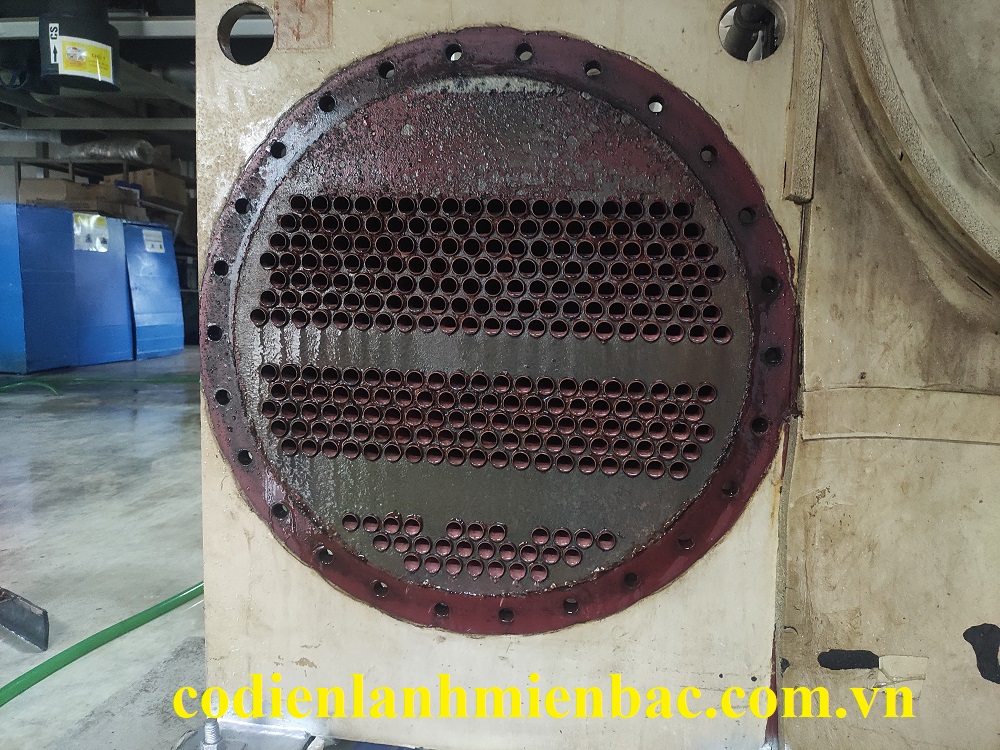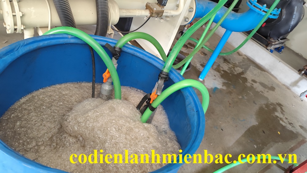 Tháo hệ thống đã tẩy kiểm tra và cọ rửa bằng máy chuyên dụng để cọ rửa những cặn bẩn còn sót lại trong bình ngưng.