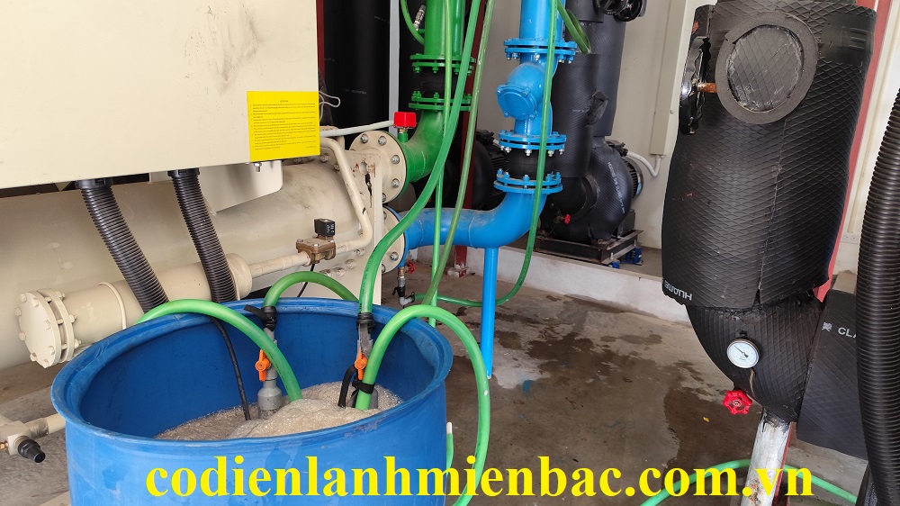 Chiller là cụm máy sử dụng môi chất là nước để truyền tải nhiệt. Do trong nước có rất nhiều thành phần các chất vô cơ, hữu cơ hòa tan như: Ca, Mg, Fe, Zn, Oxi,….. Nên sau một thời gian sử dụng một số chất này kết tủa, lắng đọng bám vào bề mặt hệ thống ống kim loại. Từ đó làm giảm hiệu suất trao đổi nhiệt, ăn mòn hệ thống và cản trở sự lưu thông của dòng nước. Vậy việc tẩy rửa bình ngưng là công việc bắt buộc phải thực hiện định kỳ nếu bạn muốn hệ thống đó hoạt động đạt hiệu suất cao, không tốn điện năng, v.v..